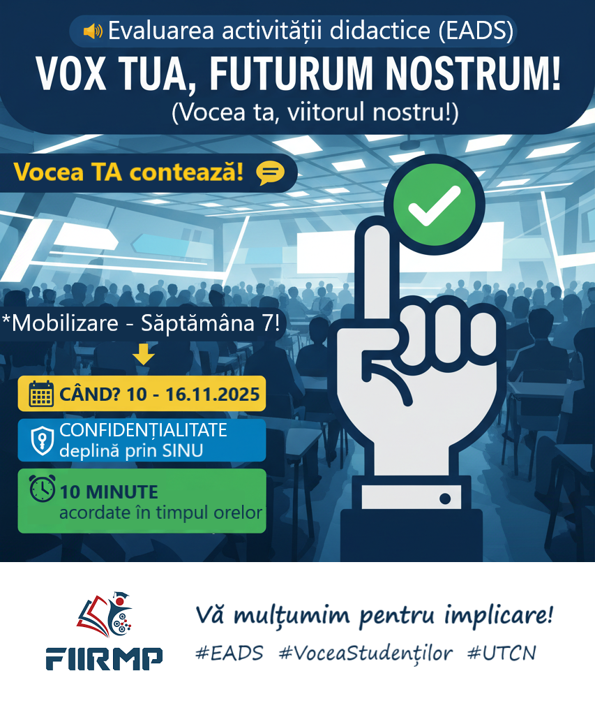 Suntem în perioada în care opinia voastră despre calitatea predării la IIRMP este esențială! Vă reamintim că prima etapă a Evaluării Activității Didactice de către Studenți (EADS) pentru Semestrul I 2025-2026 se desfășoară în Săptămâna 7, în perioada 10 - 16.11.2025.